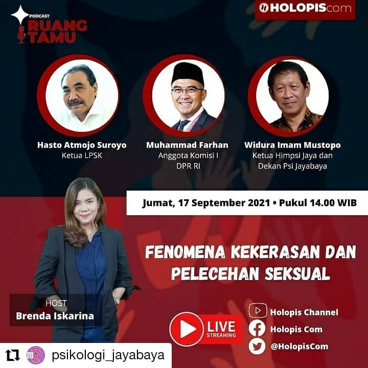 Pada 17 September 2021, Dekan Fakultas Psikologi Universitas Jayabaya, Widura Imam Mustopo, berkesempatan menjadi narasumber dalam podcast yang diselenggarakan oleh Holopis.com dengan membahas tema yang sangat relevan dan mendesak, yaitu “Fenomena Kekerasan dan Pelecehan Seksual.” Acara ini juga menghadirkan dua tokoh penting: Hasto Atmojo Suroyo selaku Ketua LPSK dan Muhammad Farhan, Anggota Komisi I DPR RI, sehingga diskusi berlangsung komprehensif dari berbagai perspektif.