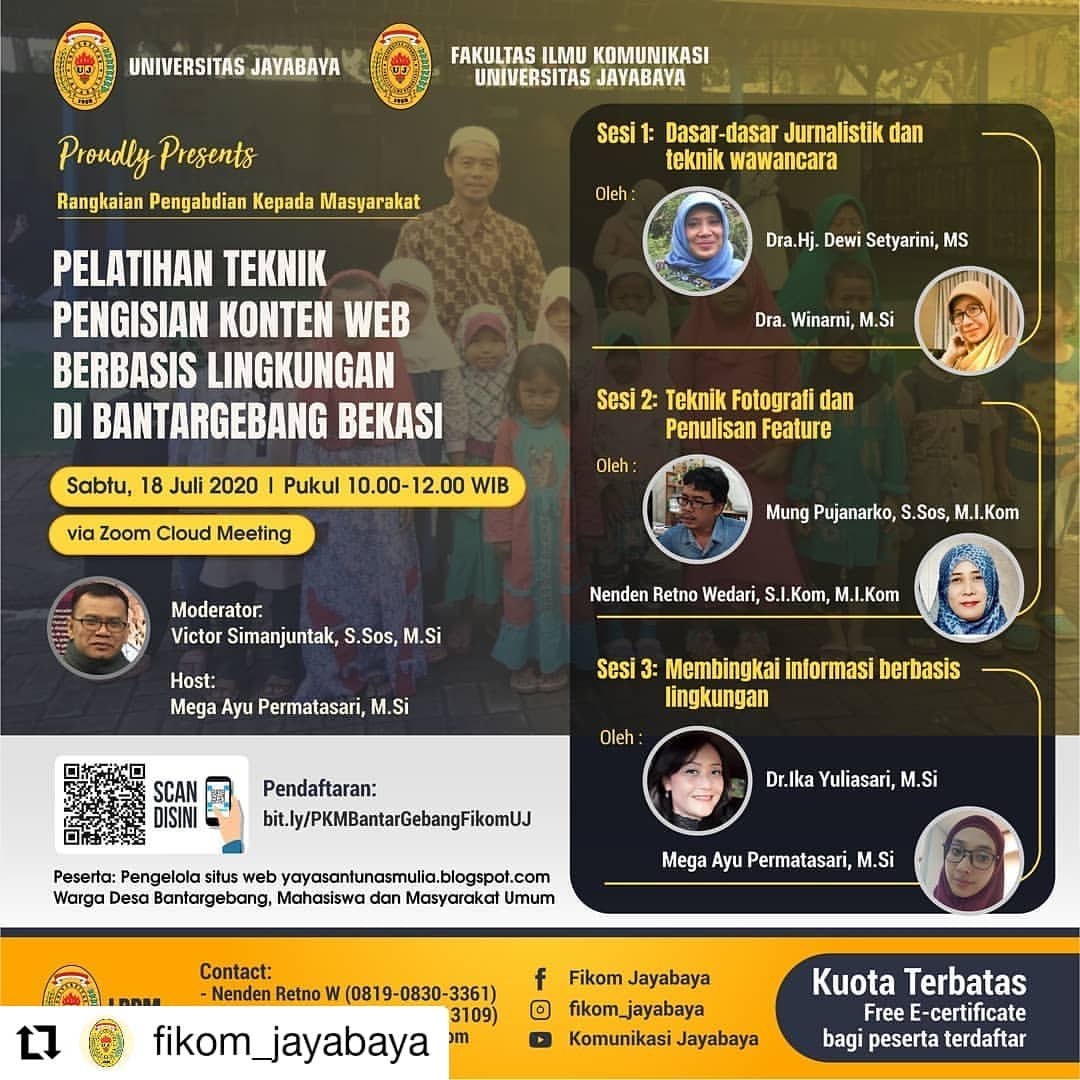 Fakultas Ilmu Komunikasi Universitas Jayabaya menyelenggarakan rangkaian kegiatan Pengabdian Kepada Masyarakat bertajuk Pelatihan Teknik Pengisian Konten Web Berbasis Lingkungan di Bantargebang, Bekasi. Kegiatan ini dilaksanakan pada Sabtu, 18 Juli 2020, pukul 10.00–12.00 WIB melalui Zoom Cloud Meeting, dan diikuti oleh pengelola situs web Yayasan Tunas Mulia, warga Desa Bantargebang, mahasiswa, serta masyarakat umum.