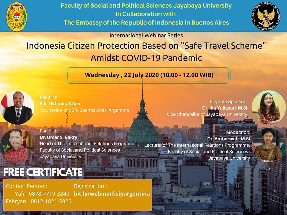 Fakultas Ilmu Sosial dan Ilmu Politik Jayabaya dan Kedutaan Besar Republik Indonesia di Buenos Aires, Argentina menggelar kegiatan International Webinar Series dengan tema “Indonesia Citizen Protection Based on Safe Travel Scheme Amidst COVID-19 Pandemic.” Webinar ini diselenggarakan sebagai bentuk kontribusi akademik dalam memberikan pemahaman mengenai upaya perlindungan Warga Negara Indonesia di luar negeri selama masa pandemi.