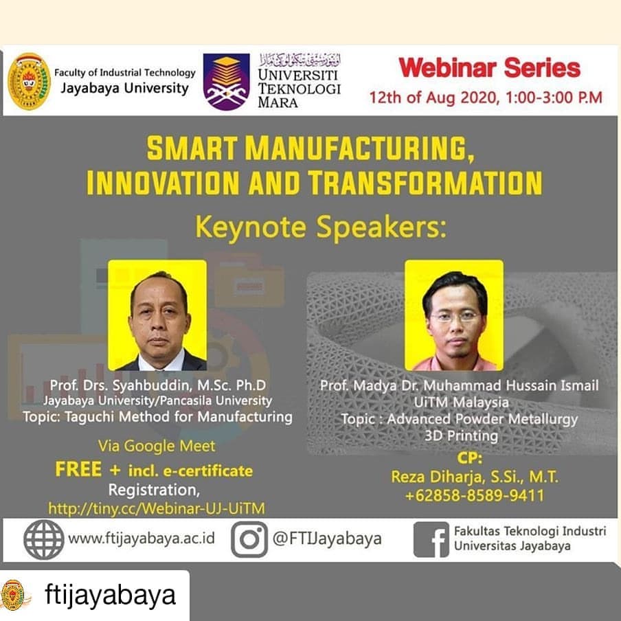 Fakultas Teknologi Industri Universitas Jayabaya bekerja sama dengan Universiti Teknologi MARA (UiTM) Malaysia menyelenggarakan webinar bertajuk “Smart Manufacturing, Innovation and Transformation”. Kegiatan ini menghadirkan pembicara-pembicara berkompeten yang akan membahas tren terkini di dunia industri, inovasi teknologi, serta transformasi proses manufaktur di era digital.
