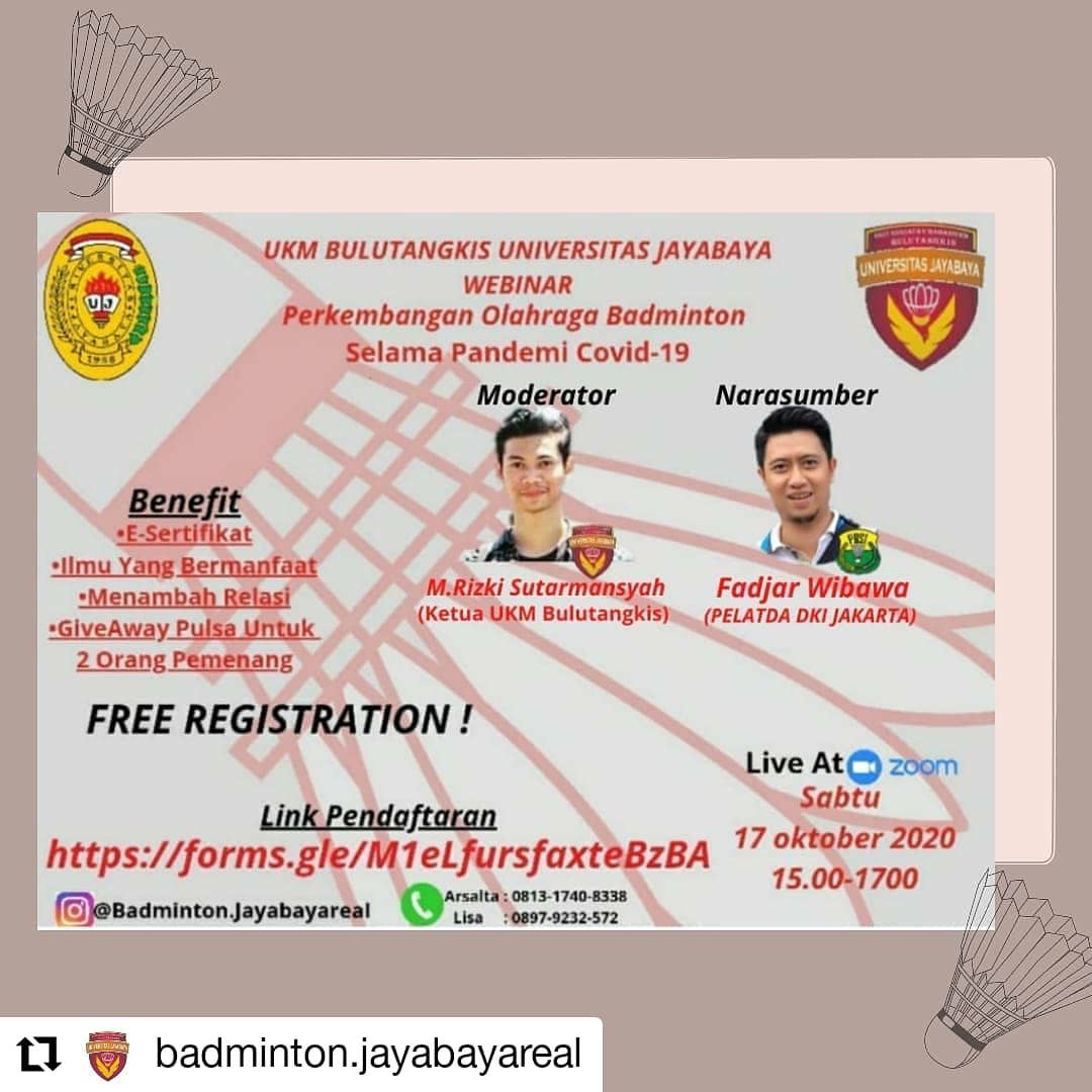 UKM Bulutangkis Universitas Jayabaya mengundang semua mahasiswa dan pecinta olahraga untuk mengikuti webinar menarik bertajuk “Perkembangan Olahraga Badminton Selama Pandemi COVID-19”. Acara ini bertujuan untuk membahas bagaimana olahraga bulutangkis tetap bisa berkembang dan dijalankan meski dalam situasi pandemi, sekaligus memberikan wawasan dan tips agar tetap aktif dan sehat di masa adaptasi kebiasaan baru.