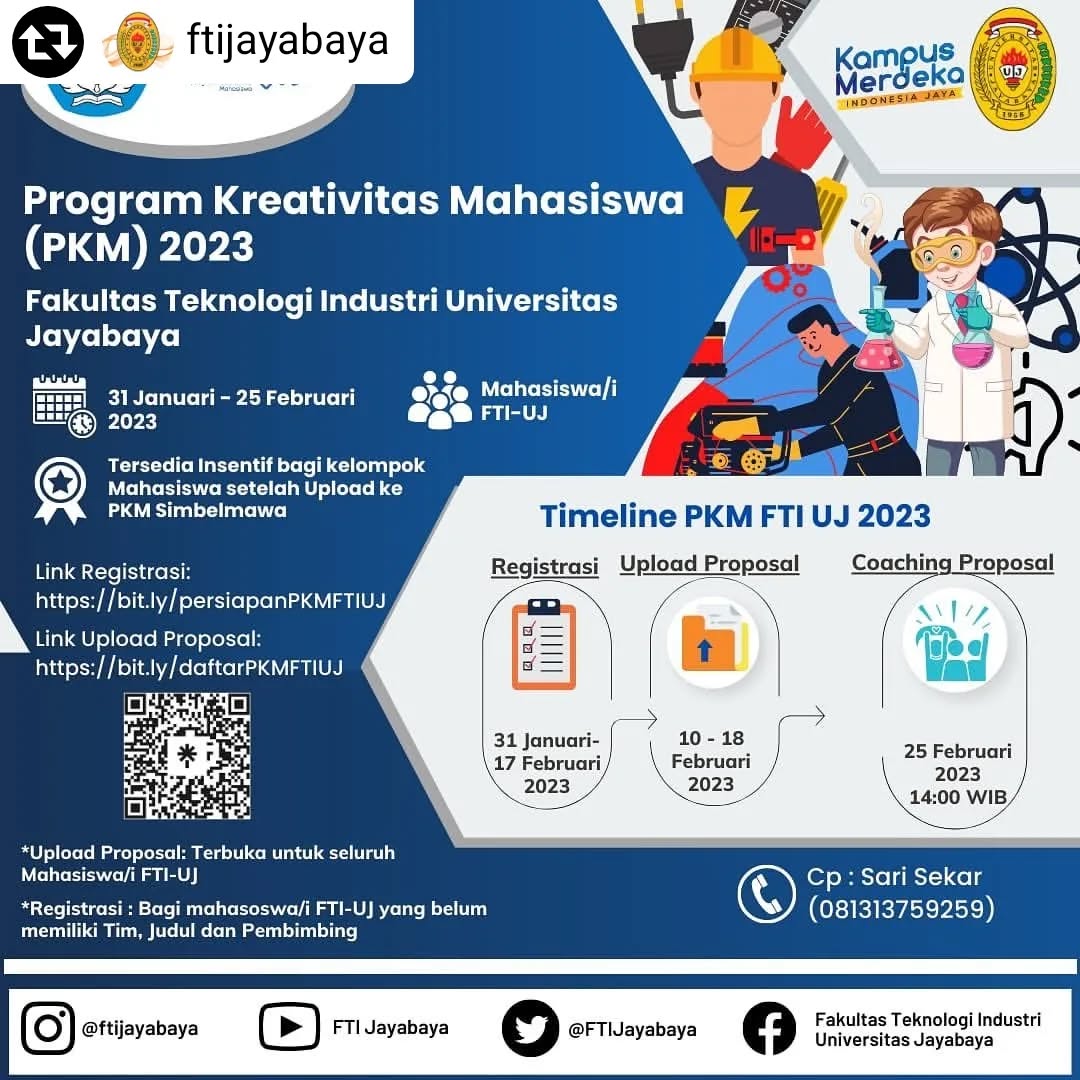 Fakultas Teknologi Informasi Universitas Jayabaya (FTI UJ) membuka kesempatan bagi seluruh mahasiswa untuk berpartisipasi dalam Program Kreativitas Mahasiswa (PKM) FTI UJ Tahun 2023. Kegiatan ini menjadi wadah bagi mahasiswa untuk menyalurkan ide, gagasan ilmiah, serta inovasi kreatif yang berkontribusi pada pengembangan ilmu pengetahuan dan teknologi.