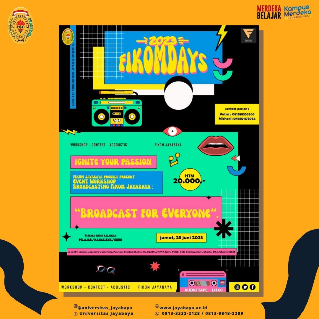 Fakultas Ilmu Komunikasi Universitas Jayabaya kembali menghadirkan kegiatan kreatif bertajuk FIKOMDAYS 2023 dengan tema “Ignite Your Passion”. Kegiatan ini merupakan wadah pengembangan minat dan bakat di bidang komunikasi yang dikemas melalui rangkaian workshop, contest, dan acoustic performance.