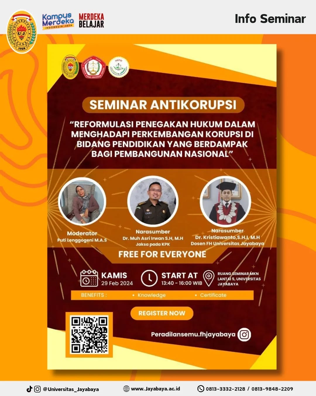 Untuk menanggapi isu ini, Peradilan Semu Fakultas Hukum Universitas Jayabaya mengadakan Seminar Antikorupsi, sebagai wadah edukasi dan diskusi tentang pentingnya integritas, transparansi, dan akuntabilitas di dunia pendidikan.