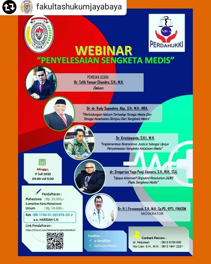 Webinar ini terbuka untuk umum dan menjadi kesempatan emas bagi mahasiswa, tenaga medis, maupun praktisi hukum untuk mendapatkan wawasan mendalam mengenai penyelesaian sengketa medis secara hukum dan alternatif.