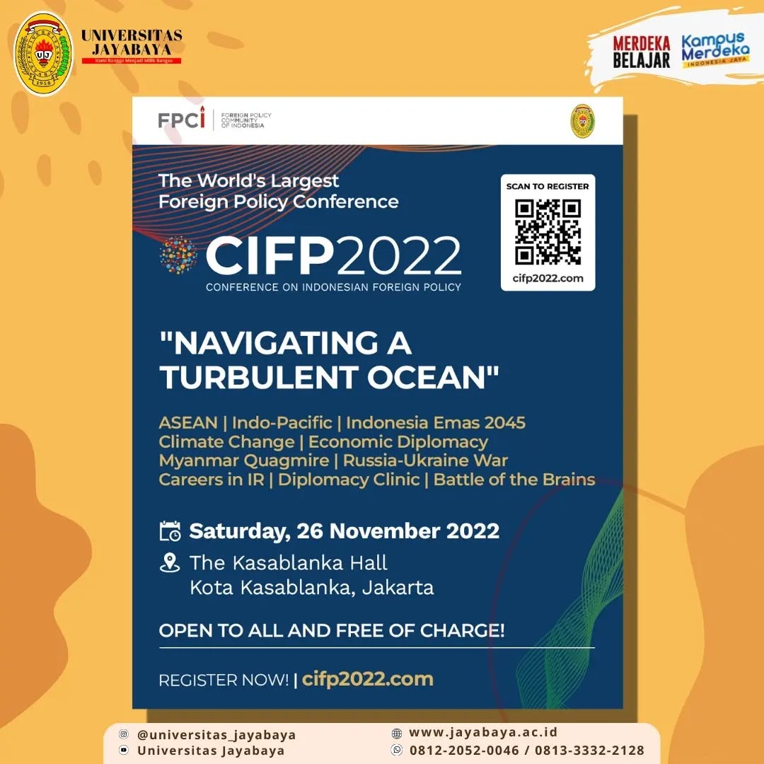Conference on Indonesian Foreign Policy 2022 will be convened with the big theme "Navigating a Turbulent Ocean," and it will feature a range of sessions, including Careers in IR and Diplomacy Clinic!