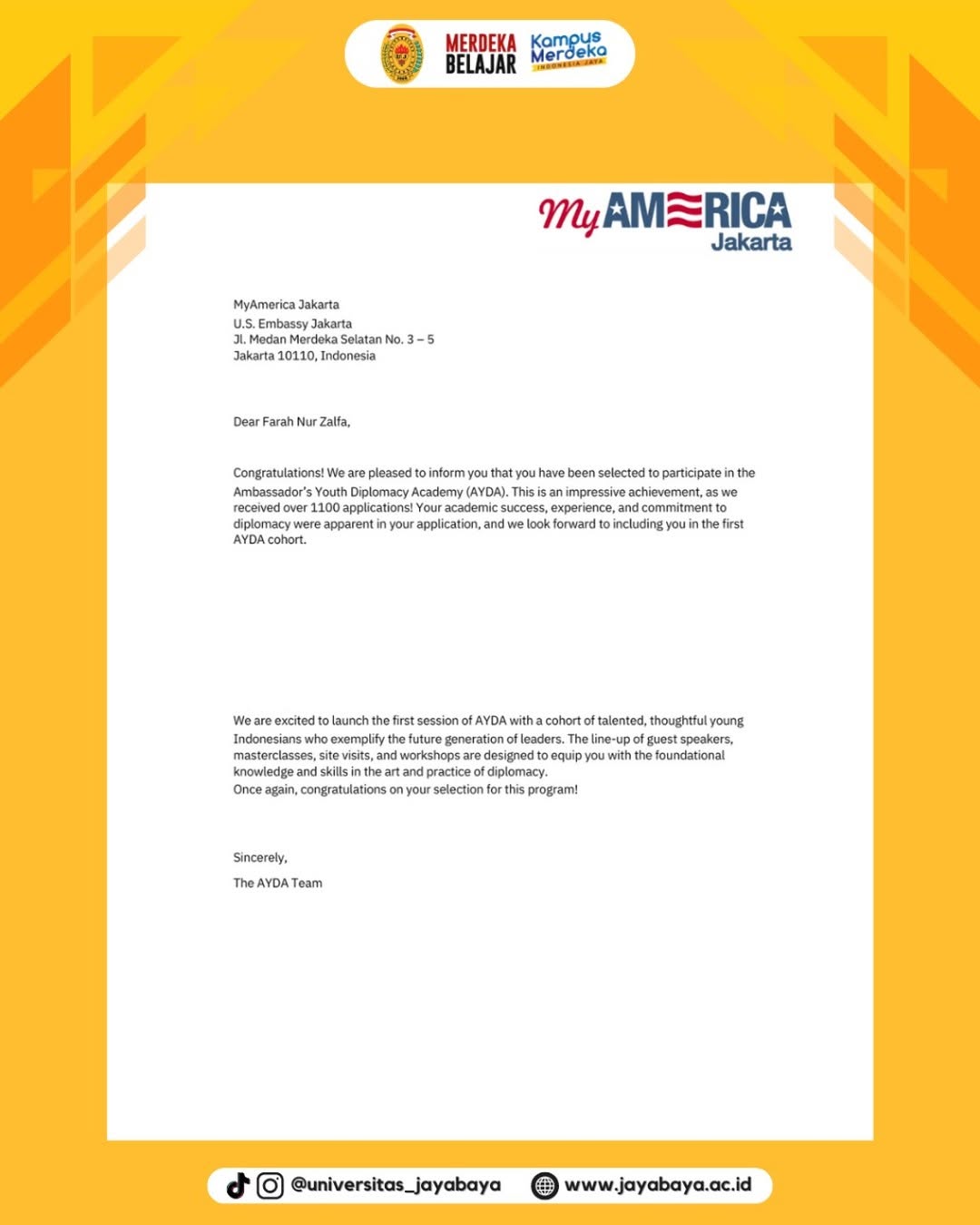 Universitas Jayabaya mengucapkan terima kasih kepada Farah Nur Zalfa atas prestasi yang dicapai. Semoga kesempatan berharga ini dapat menjadi pengalaman yang memperluas perspektif, memperkuat jejaring, dan membuka jalan bagi kontribusi yang lebih besar di masa depan, baik dalam ranah akademik maupun dunia diplomasi.