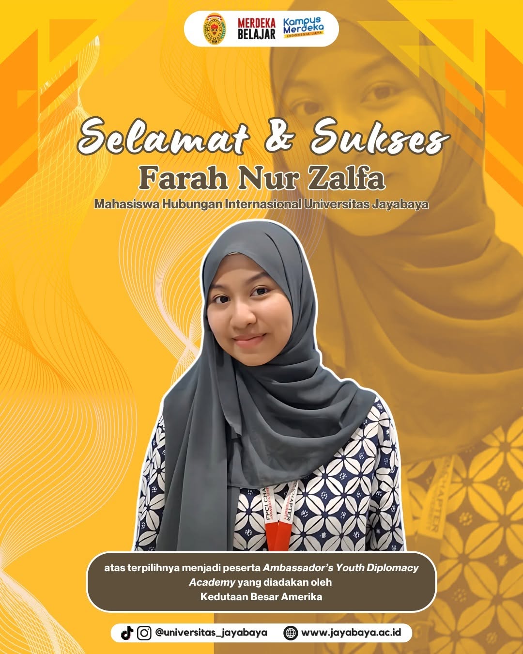Farah Nur Zalfa, Mahasiswa Fakultas Ilmu Sosial dan Ilmu Politik Universitas Jayabaya, telah terpilih sebagai peserta Ambassador's Youth Diplomacy Academy yang diselenggarakan oleh Kedutaan Besar Amerika.