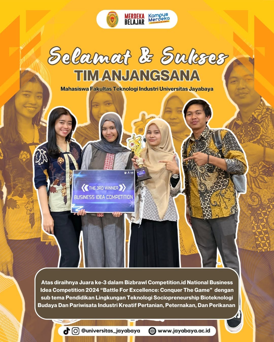 Tim Anjangsana dari Fakultas Teknologi Industri Universitas Jayabaya berhasil meraih Juara 3 dalam ajang Bizbrawl Competition.id, National Business Idea Competition 2024 bertema “Battle For Excellence: Conquer The Game”.