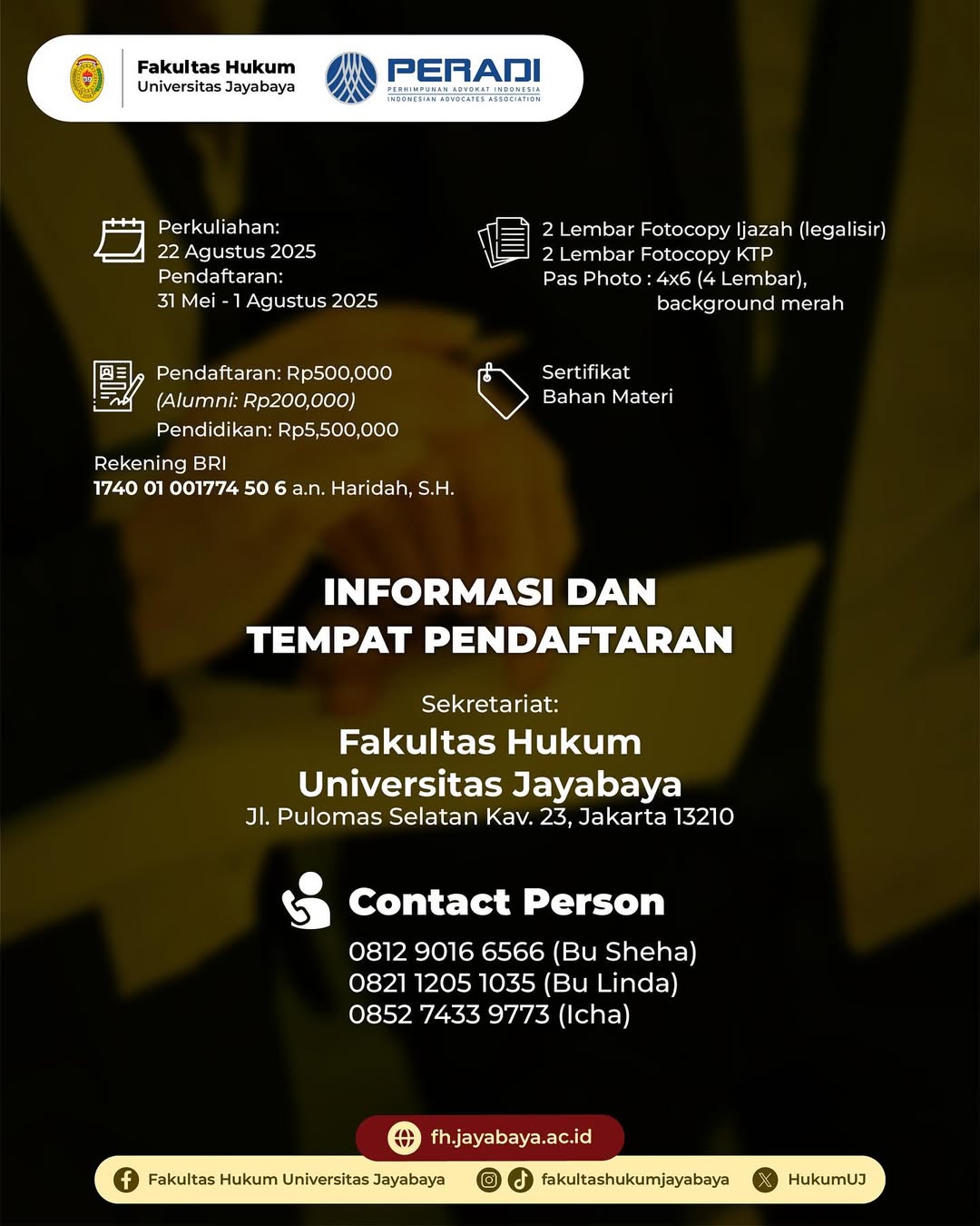Mari bergabung dalam PKPA Universitas Jayabaya dan wujudkan impian menjadi advokat yang berkualitas, beretika, serta mampu memberikan kontribusi positif bagi sistem hukum Indonesia.