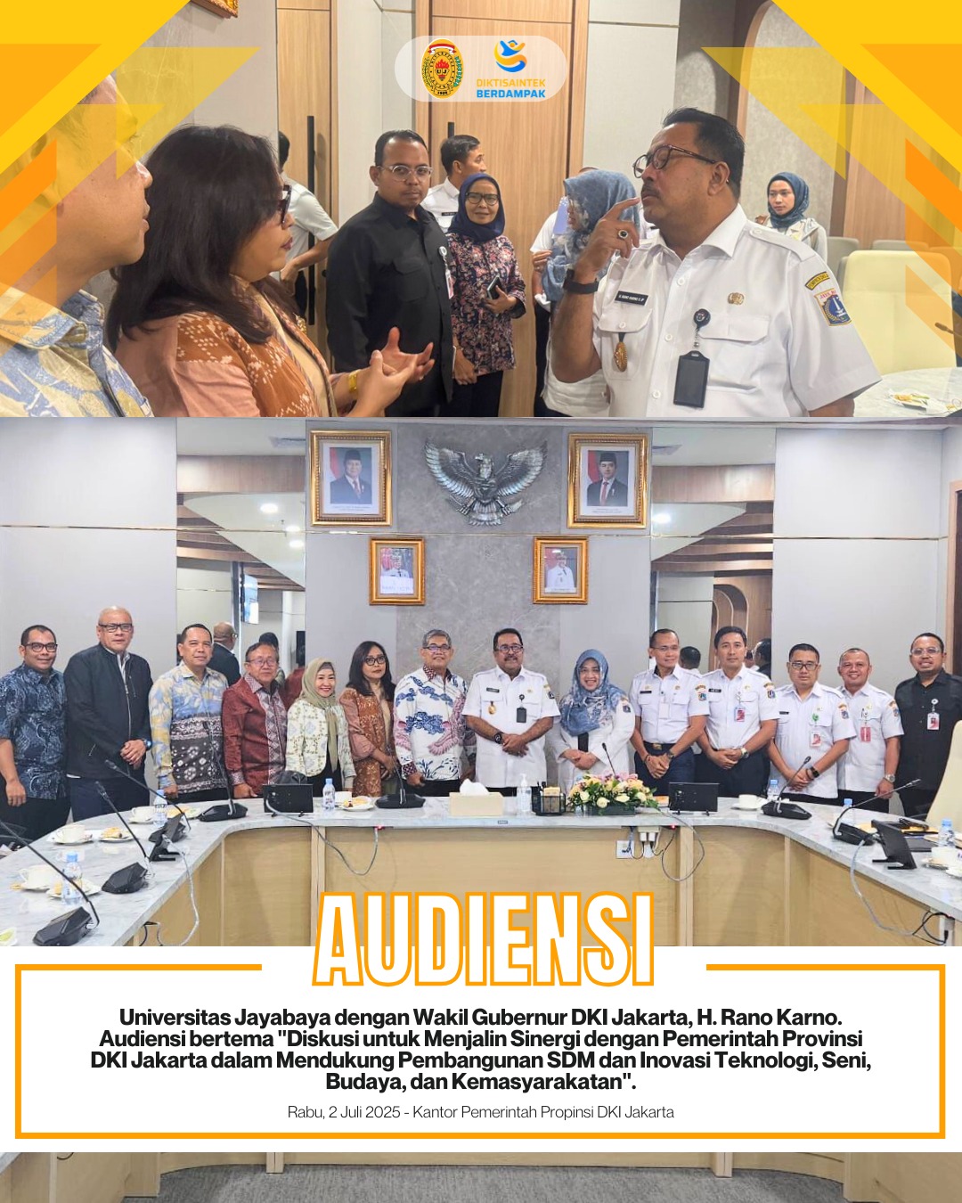 Universitas Jayabaya telah melaksanakan kegiatan Audiensi dengan Pemerintah Provinsi DKI Jakarta pada Rabu, 2 Juli 2025, mengusung tema “Diskusi untuk Menjalin Sinergi dengan Pemerintah Provinsi DKI Jakarta dalam Mendukung Pembangunan SDM dan Inovasi Teknologi, Seni, Budaya, dan Kemasyarakatan.”