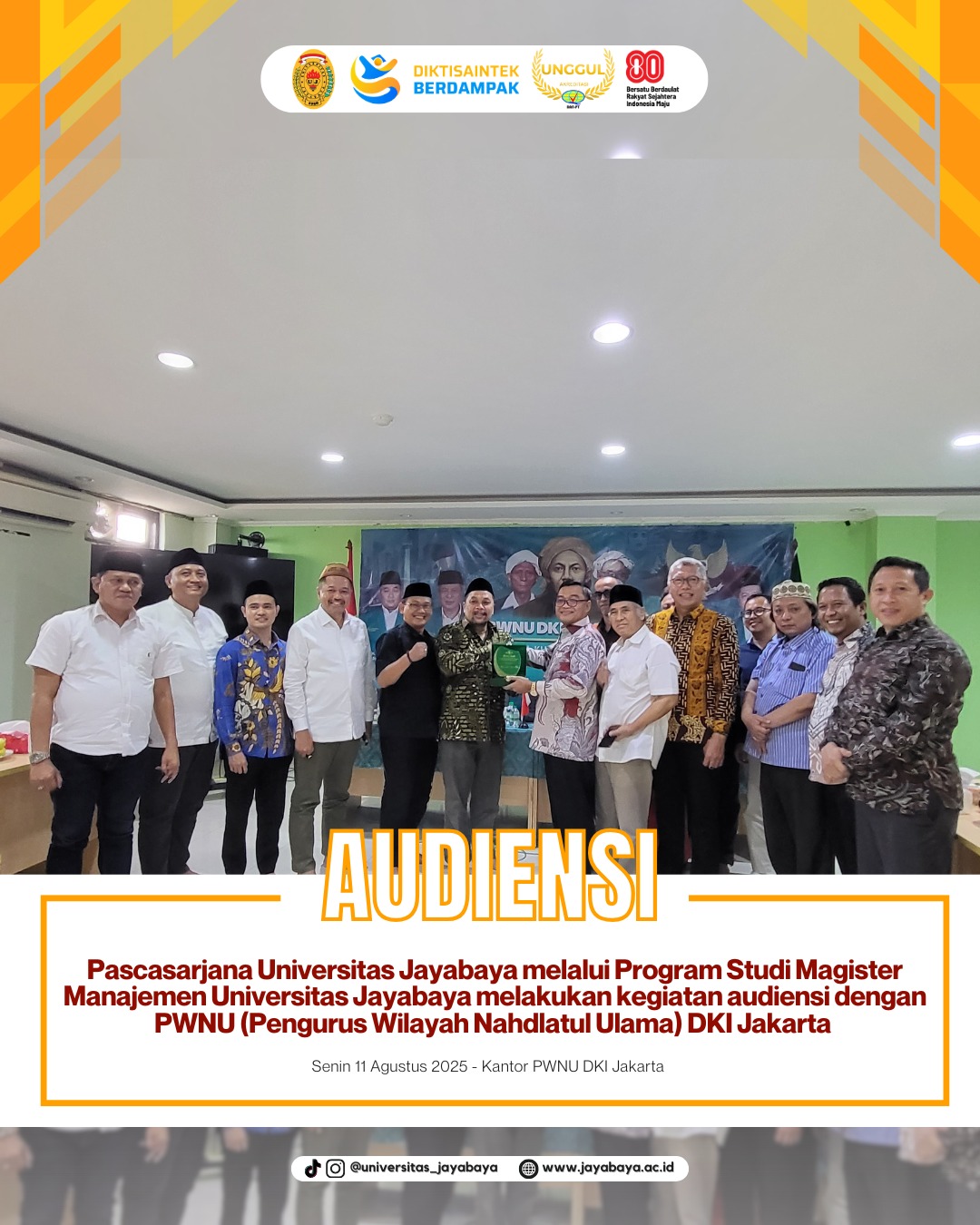 Program Studi Magister Manajemen Pascasarjana Universitas Jayabaya mengadakan audiensi dengan Pengurus Wilayah Nahdlatul Ulama (PWNU) DKI Jakarta di Kantor PWNU, Utan Kayu. Pertemuan ini menjadi momen penting untuk menjajaki peluang kerja sama di berbagai bidang strategis. Diskusi dalam audiensi mencakup rencana kolaborasi dalam pengabdian masyarakat, pengembangan akademik, serta kajian hukum melalui LPBHNU. Langkah ini diharapkan dapat memperkuat kontribusi akademik Universitas Jayabaya sekaligus memperluas jejaring institusi ke masyarakat luas.