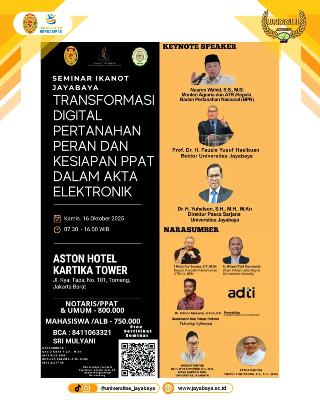 IKANOT Universitas Jayabaya menyelenggarakan seminar bertajuk “TRANSFORMASI DIGITAL PERTANAHAN: PERAN DAN KESIAPAN PPAT DALAM AKTA ELEKTRONIK”. Acara ini menghadirkan diskusi mendalam mengenai digitalisasi pertanahan dan implementasi akta elektronik, serta peran strategis PPAT dalam mendukung transformasi tersebut.
