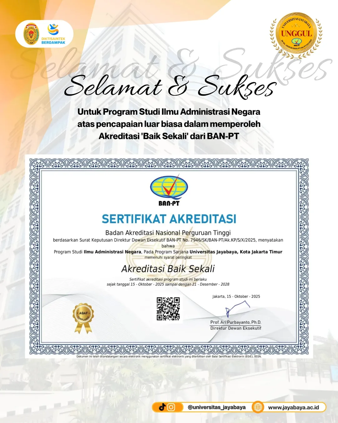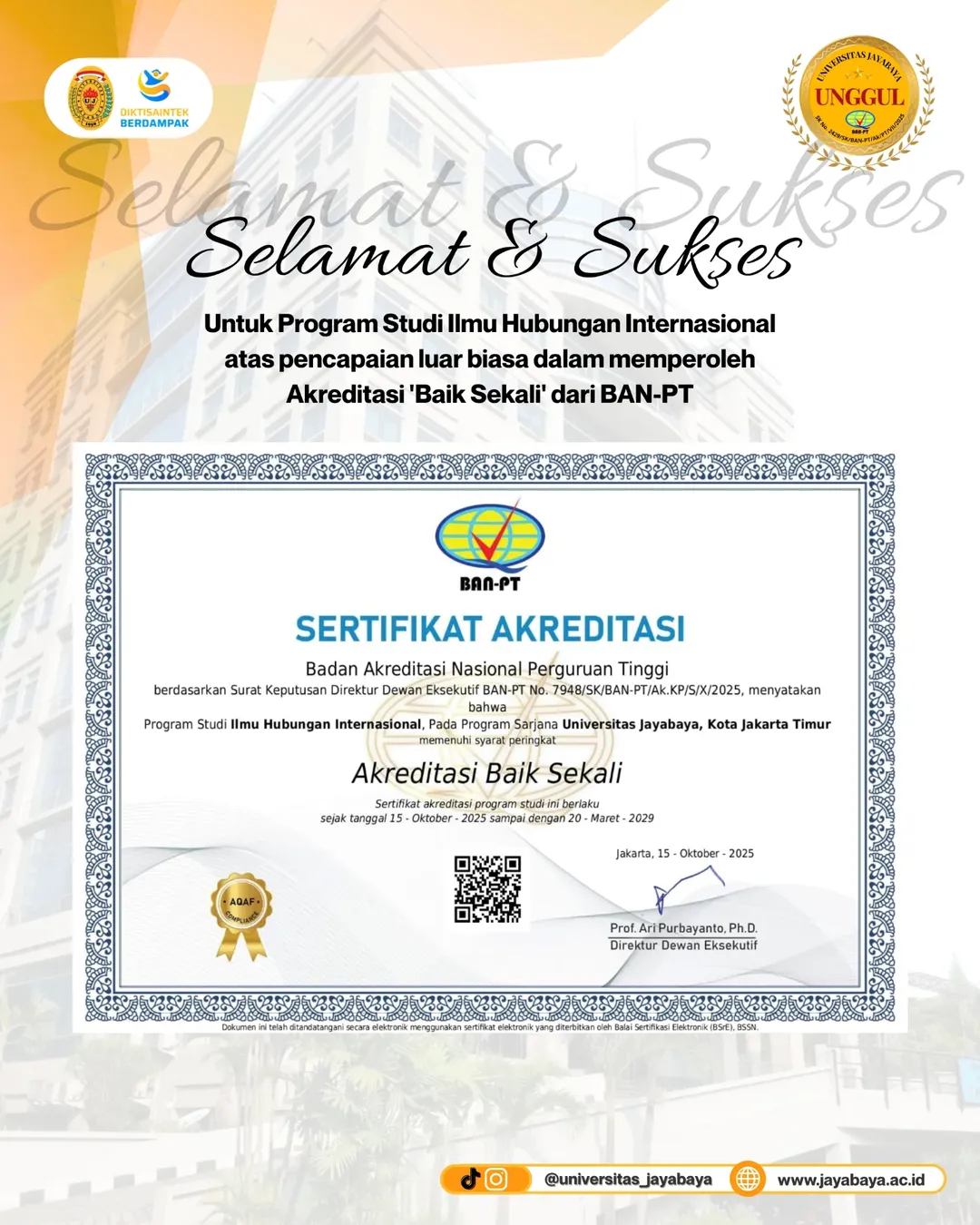 Keberhasilan ini melengkapi prestasi Akreditasi Institusi Universitas Jayabaya yang telah ditetapkan memperoleh predikat Unggul, menegaskan kualitas pendidikan dan reputasi universitas di tingkat nasional. Prestasi ini merupakan hasil dari kerja keras, dedikasi, dan sinergi seluruh civitas akademika, termasuk dosen, mahasiswa, tenaga kependidikan, serta dukungan aktif para alumni.
