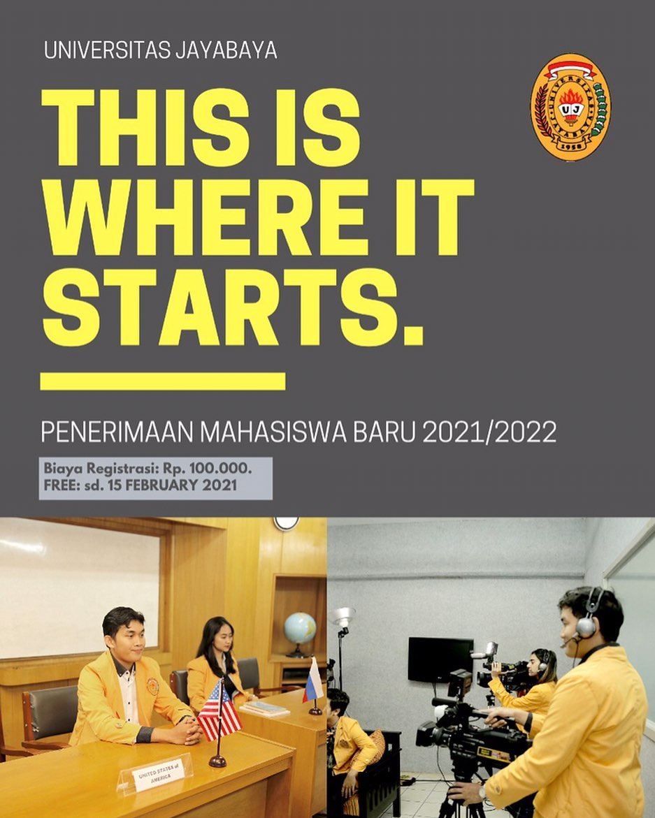 Memasuki tahun ajaran baru 2021/2022, Universitas Jayabaya kembali membuka kesempatan bagi para calon mahasiswa yang ingin melanjutkan pendidikan tinggi dan mengembangkan potensi diri di lingkungan kampus yang unggul, inovatif, dan berdaya saing. Universitas Jayabaya resmi membuka pendaftaran mahasiswa baru dengan memberikan free biaya registrasi untuk mahasiswa baru seluruh fakultas dan program studi yang siap mencetak generasi muda berkompeten dan berkarakter.