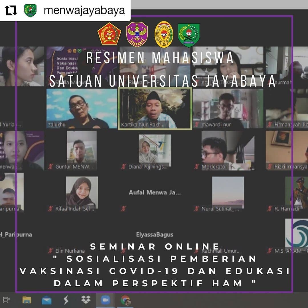 Resimen Mahasiswa Satuan Universitas Jayabaya telah sukses menyelenggarakan Seminar Online bertema “Sosialisasi Pemberian Vaksinasi COVID-19 dan Edukasi dalam Perspektif HAM” pada Sabtu, 20 Februari 2021 pukul 13.00 WIB. Kegiatan ini menjadi ruang edukatif untuk meningkatkan pemahaman masyarakat mengenai pentingnya vaksinasi serta kaitannya dengan perlindungan hak asasi manusia.