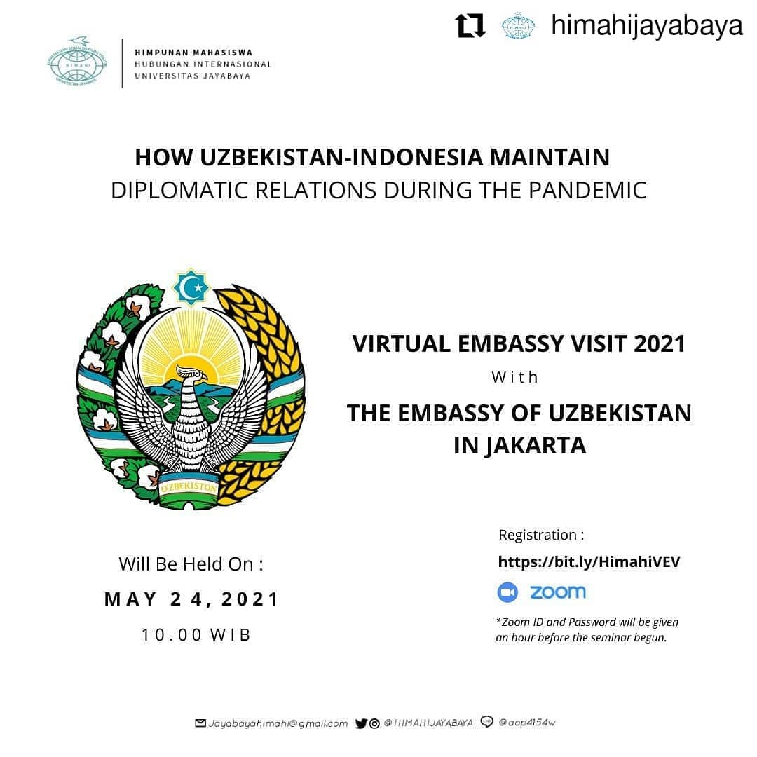 HIMA-HI Universitas Jayabaya dengan bangga telah mengadakan Kunjungan Kedutaan Virtual bersama Kedutaan Besar Uzbekistan di Jakarta, dengan tema yang mendalam “Bagaimana Uzbekistan dan Indonesia Mempertahankan Hubungan Diplomatik Selama Pandemi” pada 24 Mei 2021.
