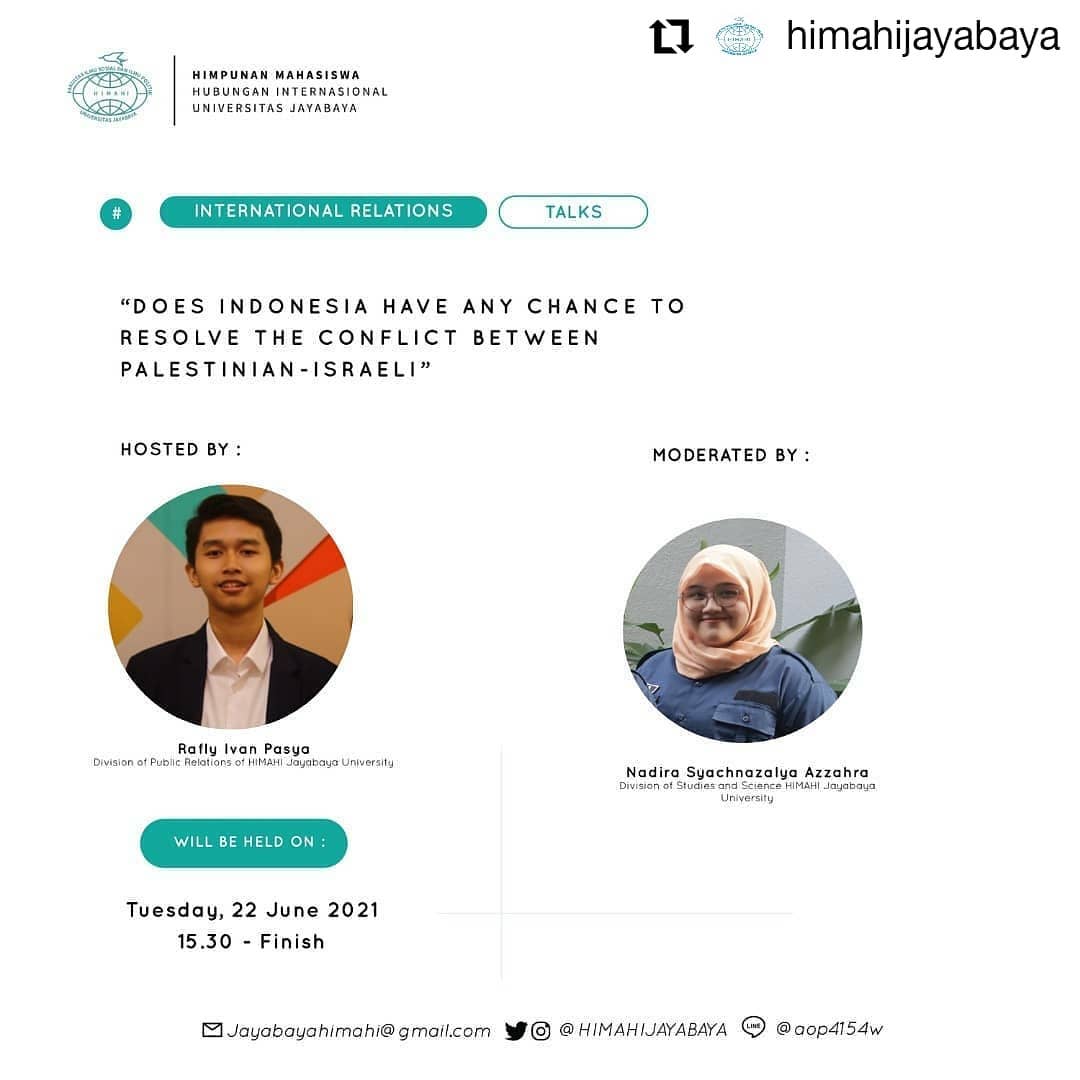 Pada 22 Juni 2021, Himpunan Mahasiswa Hubungan Internasional (HIMA-HI) Universitas Jayabaya menyelenggarakan acara HI Talks dengan tema “Does Indonesia Have any Chances to Resolve the Conflict Between Palestinian-Israeli”. Konflik yang telah berlangsung puluhan tahun ini tetap menjadi sorotan dunia karena dampaknya yang luas terhadap stabilitas regional dan global. Situasi ini menimbulkan berbagai pertanyaan penting, termasuk hingga kapan konflik ini akan berlanjut dan langkah konkret apa yang dapat dilakukan oleh komunitas internasional untuk mendorong perdamaian.