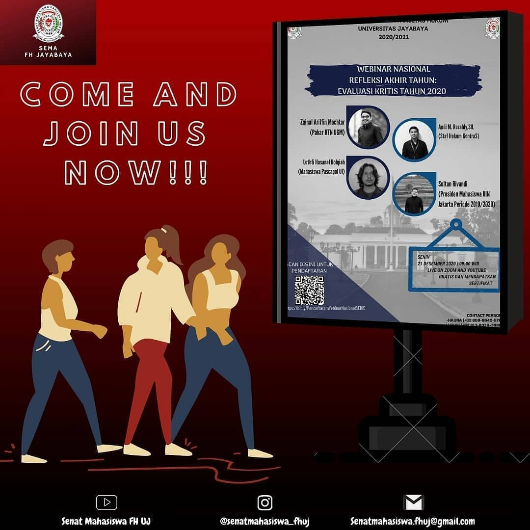 Mengakhiri tahun 2020, SEMA Fakultas Hukum Universitas Jayabaya mempersembahkan Webinar Nasional “Refleksi Akhir Tahun: Evaluasi Kritis Tahun 2020”. Acara ini menjadi wadah bagi mahasiswa, akademisi, dan publik untuk meninjau kembali dinamika hukum, sosial, dan politik sepanjang tahun yang penuh tantangan ini.