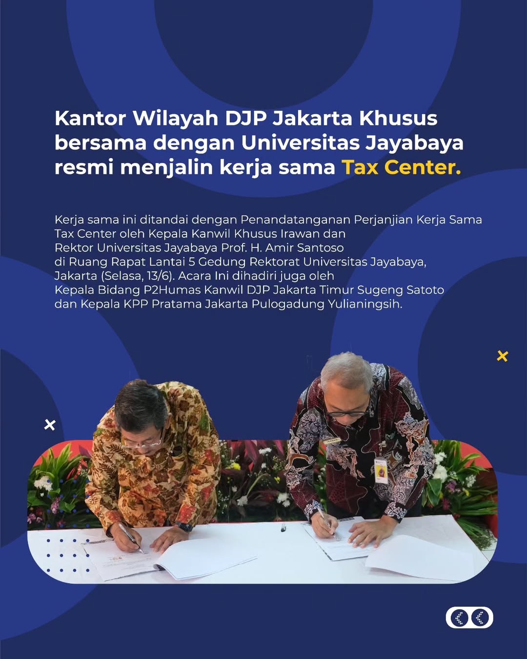 Universitas Jayabaya kini secara resmi memiliki Tax Center Universitas Jayabaya sebagai bentuk komitmen dalam mendukung peningkatan literasi dan kesadaran perpajakan di lingkungan perguruan tinggi. Peresmian Tax Center ini ditandai dengan Penandatanganan Perjanjian Kerja Sama antara Kantor Wilayah Direktorat Jenderal Pajak (Kanwil DJP) Jakarta Khusus dan Universitas Jayabaya.