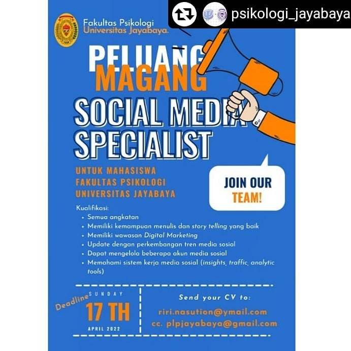 Fakultas Psikologi Universitas Jayabaya kembali membuka kesempatan magang untuk mahasiswa semua angkatan yang ingin mengasah kemampuan di dunia digital & media sosial!
