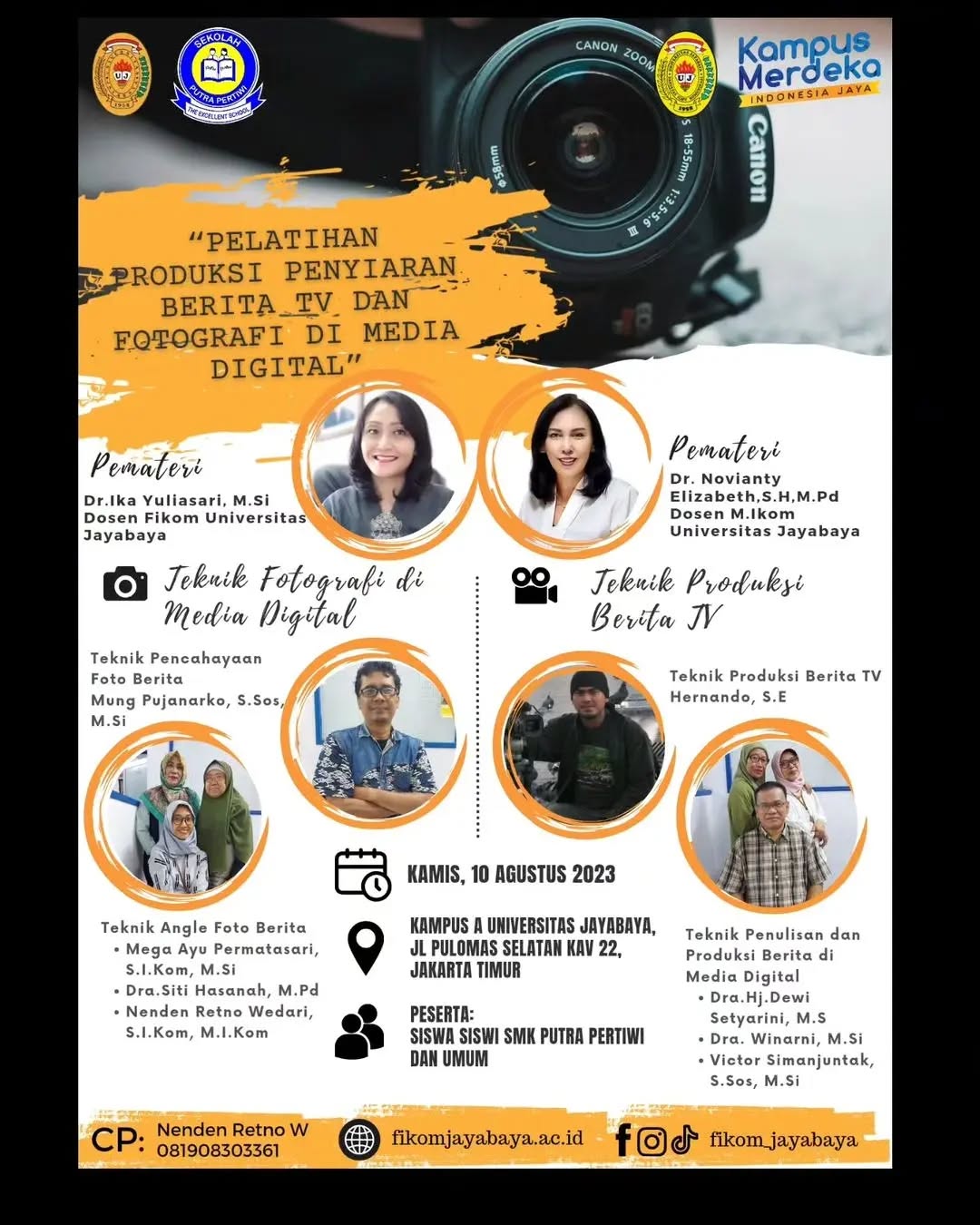 Pelatihan ini difasilitasi oleh para praktisi dan akademisi yang berpengalaman di bidang media, sehingga peserta memperoleh pemahaman yang aplikatif dan relevan dengan kebutuhan industri saat ini. Kegiatan dilaksanakan pada Kamis, 10 Agustus 2023, pukul 09.00 WIB, bertempat di Fakultas Ilmu Komunikasi Universitas Jayabaya.