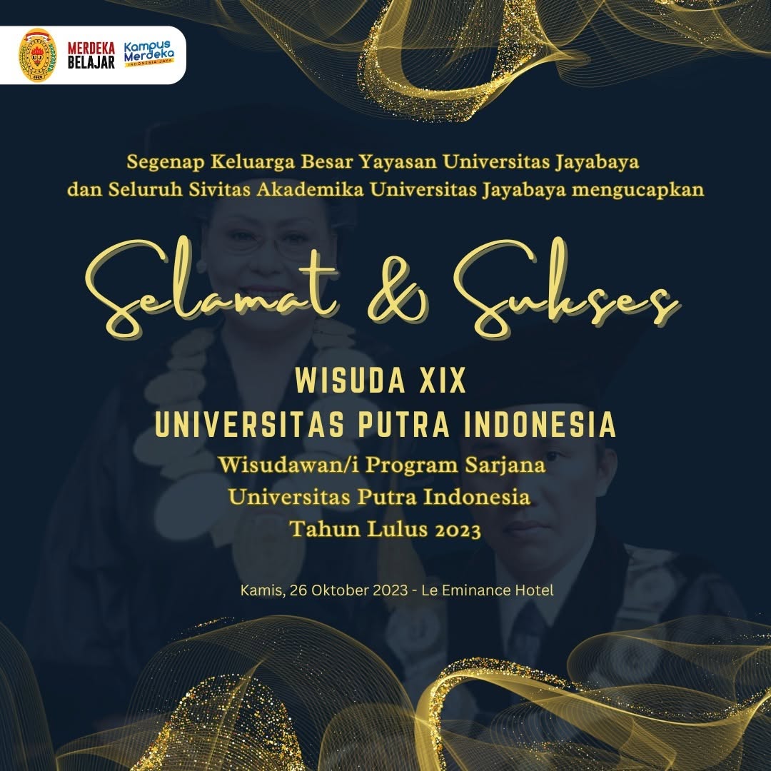Segenap Keluarga Besar Yayasan Universitas Jayabaya dan seluruh Sivitas Akademika Universitas Jayabaya mengucapkan Selamat dan Sukses atas terselenggaranya Wisuda XIX Universitas Putra Indonesia bagi Wisudawan dan Wisudawati Program Sarjana Universitas Putra Indonesia Tahun Lulus 2023.