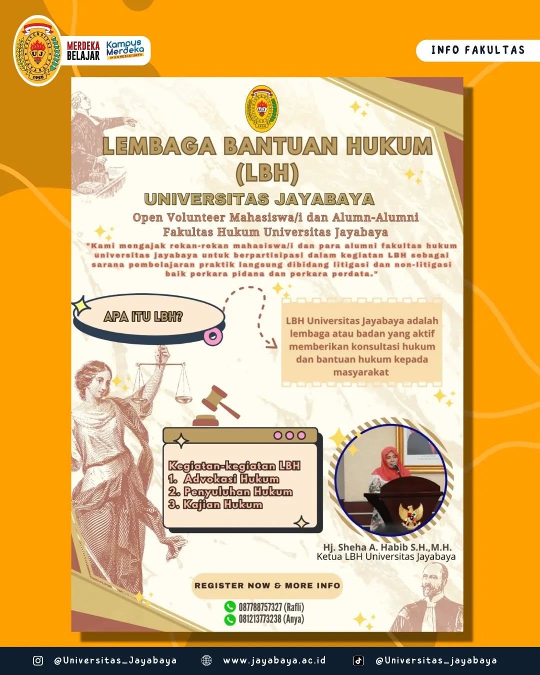 Lembaga Bantuan Hukum (LBH) Universitas Jayabaya mengajak mahasiswa/i serta alumni Fakultas Hukum Universitas Jayabaya untuk berpartisipasi dan terlibat aktif sebagai volunteer dalam berbagai kegiatan LBH. Kegiatan ini menjadi wadah pengabdian sekaligus sarana pembelajaran praktis di bidang hukum.