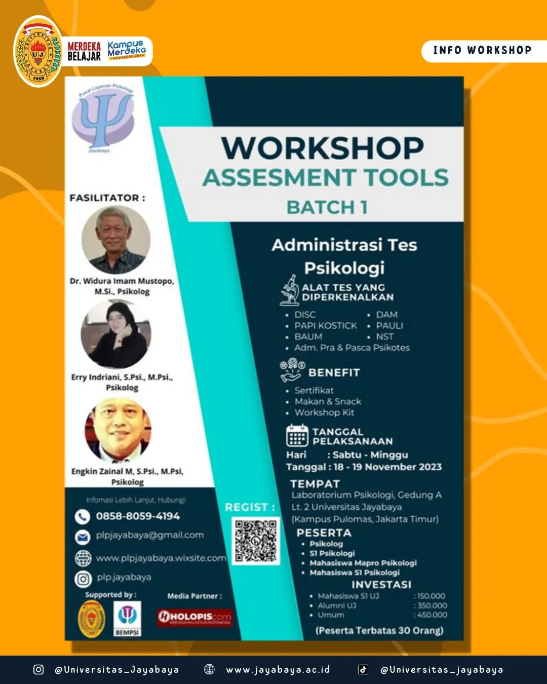 Pusat Layanan Psikologi Jayabaya menyelenggarakan kegiatan Workshop “Assessment Tools: Administrasi Alat Tes Psikologi” sebagai upaya meningkatkan pemahaman dan keterampilan peserta dalam mengenal serta mengelola administrasi alat tes psikologi secara profesional. Workshop dilaksanakan pada 18–19 November 2023, pukul 08.30–16.30 WIB, bertempat di Laboratorium Mulia Moeslim Fakultas Psikologi Gedung A Lantai 2 Universitas Jayabaya.