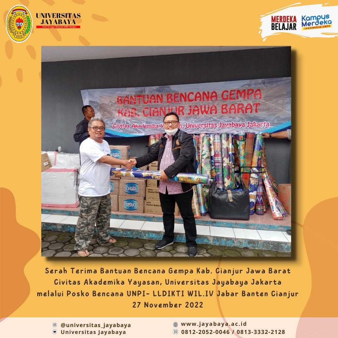Alhamdulillah, pada Minggu, 27 November 2022, civitas akademika Yayasan Universitas Jayabaya menyalurkan bantuan bagi korban bencana gempa di Kabupaten Cianjur, Jawa Barat. Bantuan diserahkan melalui Posko Bencana UNPI – LLDIKTI Wilayah IV Jabar Banten sebagai bentuk nyata kepedulian sivitas akademika terhadap sesama yang terdampak bencana.