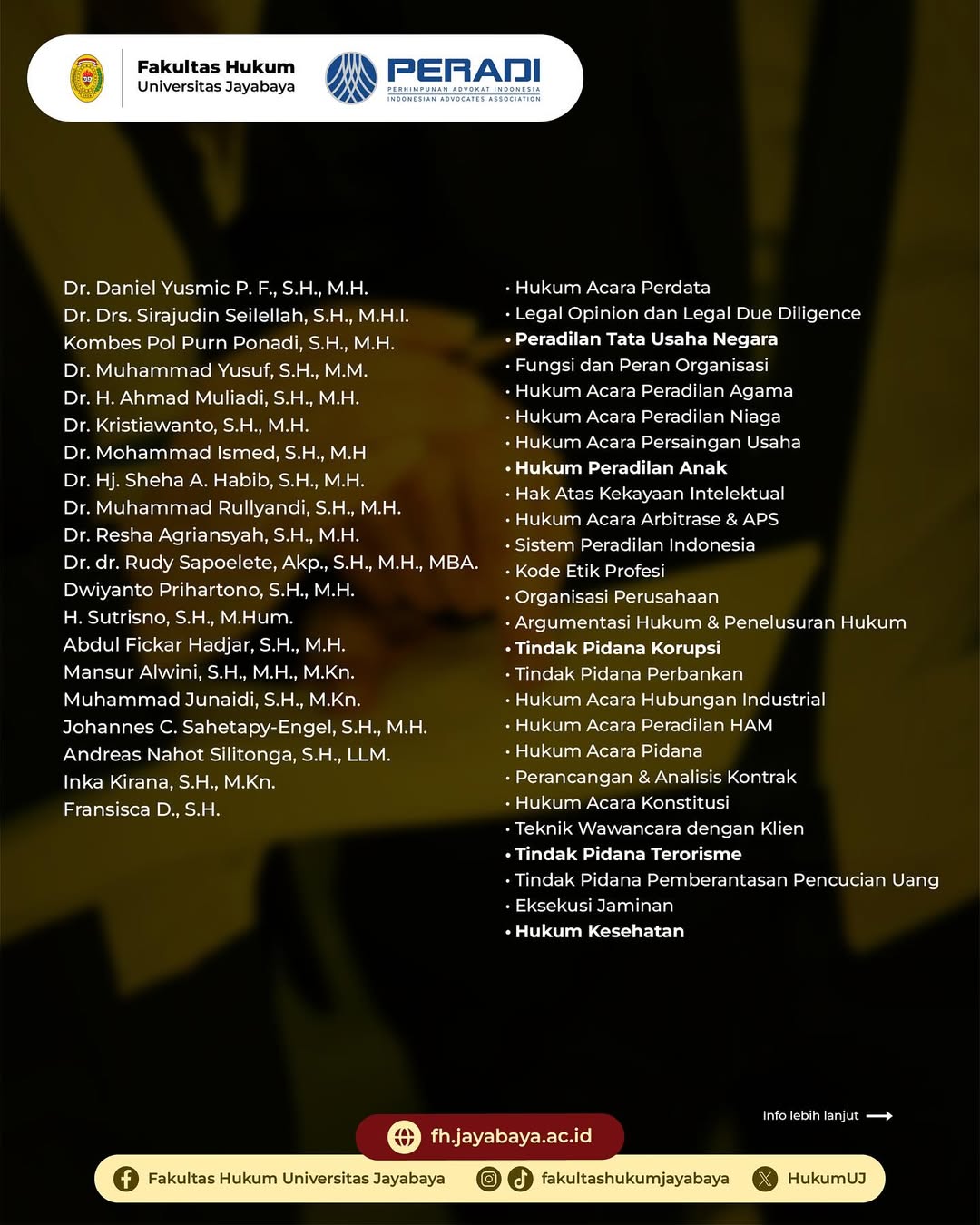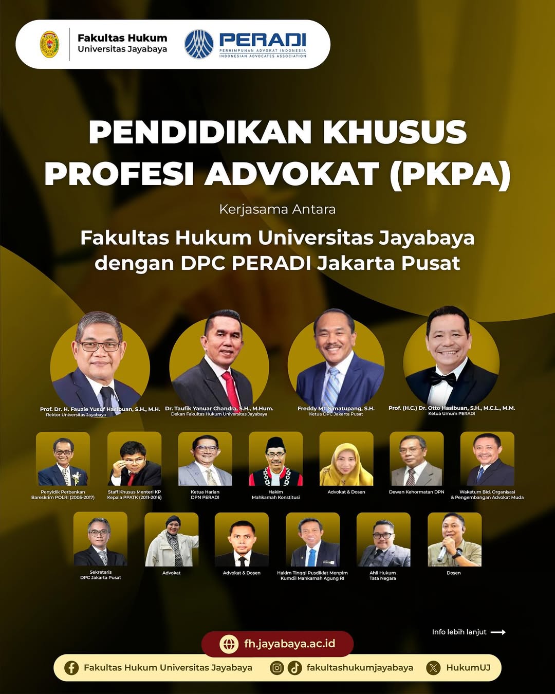 Pendidikan Khusus Profesi Advokat (PKPA) yang diselenggarakan oleh Fakultas Hukum Universitas Jayabaya bekerja sama dengan DPC PERADI Jakarta Pusat menjadi wadah strategis bagi para calon advokat untuk membangun pondasi keahlian yang solid. Melalui program ini, peserta dibimbing langsung oleh para akademisi berprestasi dan praktisi hukum yang telah memiliki rekam jejak panjang dalam dunia advokasi maupun penegakan hukum.