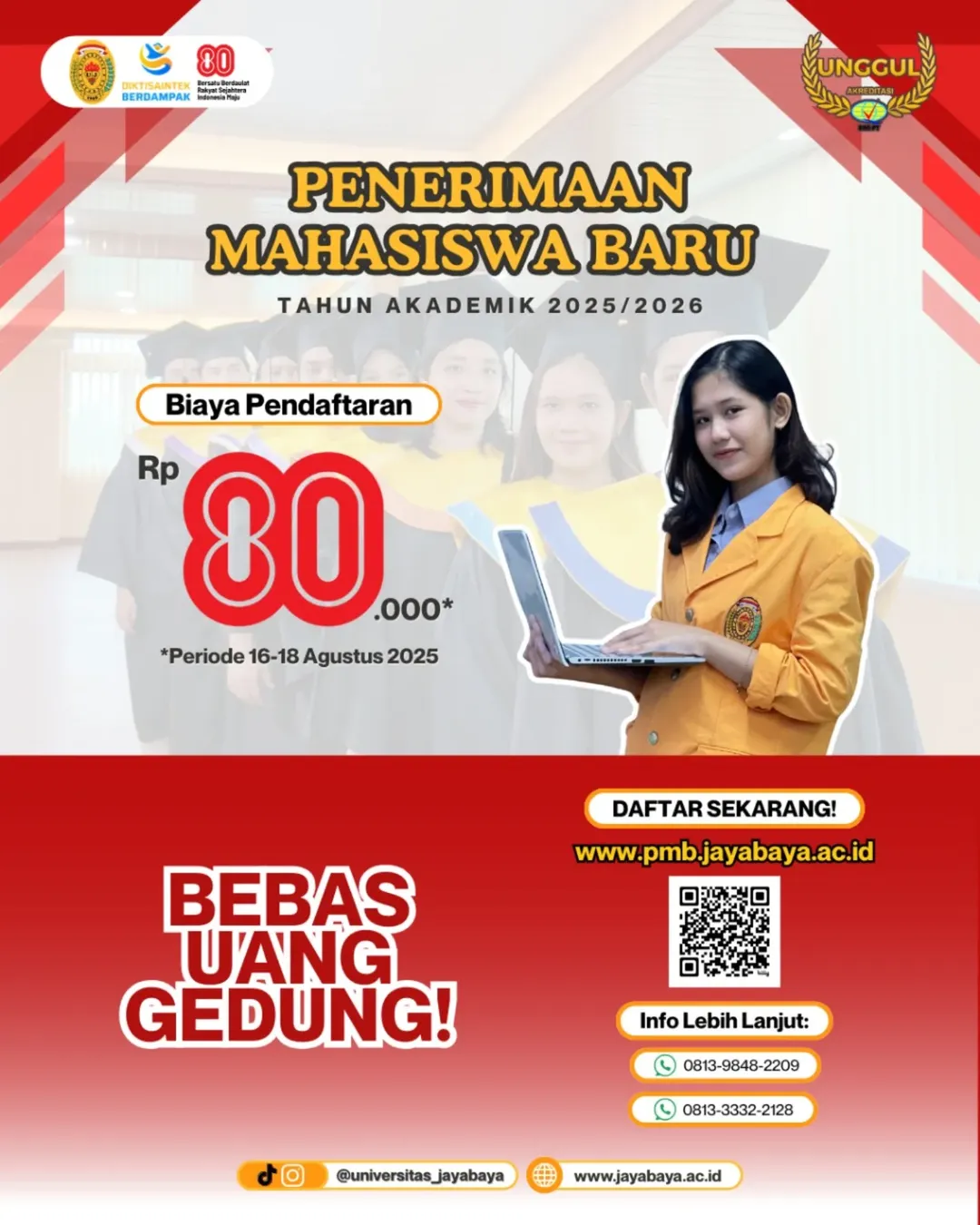 Halo calon mahasiswa! Saatnya mewujudkan impian kalian untuk menempuh pendidikan tinggi di Universitas Jayabaya. Pendaftaran online Tahun Akademik 2025/2026 kini sudah resmi dibuka.