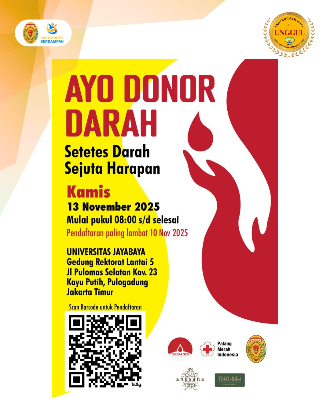 Setiap tetes darahmu bisa menjadi harapan hidup bagi orang-orang yang membutuhkannya. Jangan lewatkan kesempatan untuk berkontribusi melalui kegiatan donor darah yang bekerja sama dengan Universitas Jayabaya, Srikandi Perempuan Donor Darah Indonesia (Srikandi PDDI), dan Palang Merah Indonesia (PMI).
