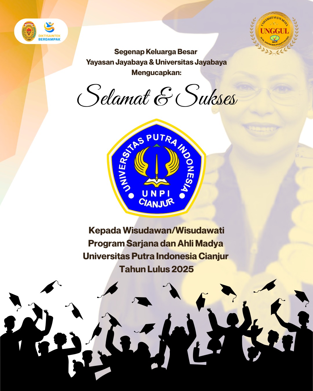 Seluruh keluarga besar Yayasan Jayabaya dan Universitas Jayabaya mengucapkan selamat dan sukses kepada para Wisudawan dan Wisudawati Program Sarjana dan Ahli Madya Universitas Putra Indonesia tahun lulus 2025.