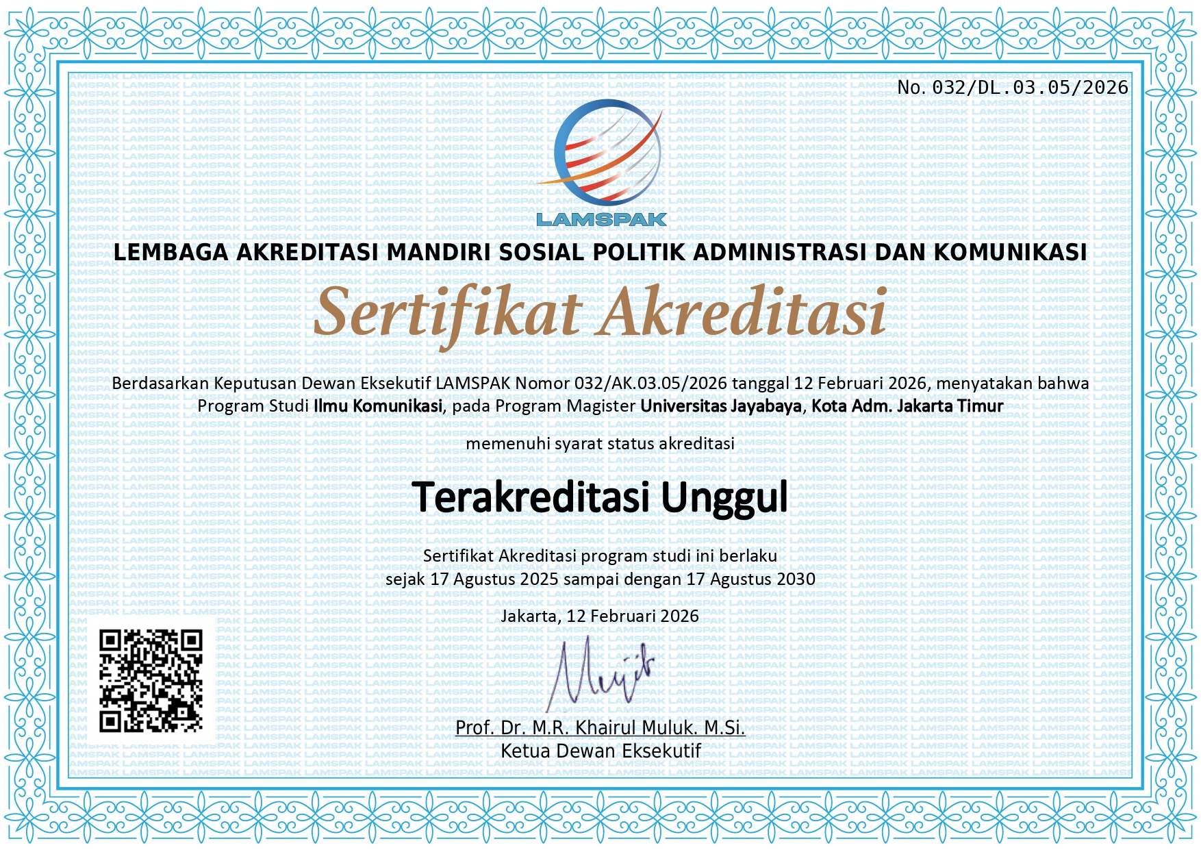 Berdasar Keputusan Lembaga Akreditasi Mandiri Sosial Politik Administrasi dan Komunikasi Nomor : 032/AK.03.05/2026 Tentang Status dan Peringkat Akreditasi Program Studi Magister Ilmu Komunikasi Universitas Jayabaya : Menetapkan Status Akreditasi Program Studi Magister Ilmu Komunikasi Universitas Jayabaya Kota Jakarta Timur Provinsi DKI Jakarta sebagai berikut: Status Akreditasi: UNGGUL.