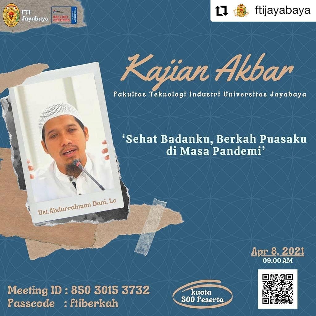 Pada 8 April 2021, Fakultas Teknologi Industri Universitas Jayabaya telah menyelenggarakan Kajian Akbar bersama Ust. Abdurrahman Dani, Lc, seorang Alumni Darul Hadist Yaman, Praktisi Thibunnabawi, sekaligus penulis buku terkenal. Dengan tema “Sehat Badanku, Berkah Puasaku di Masa Pandemi.