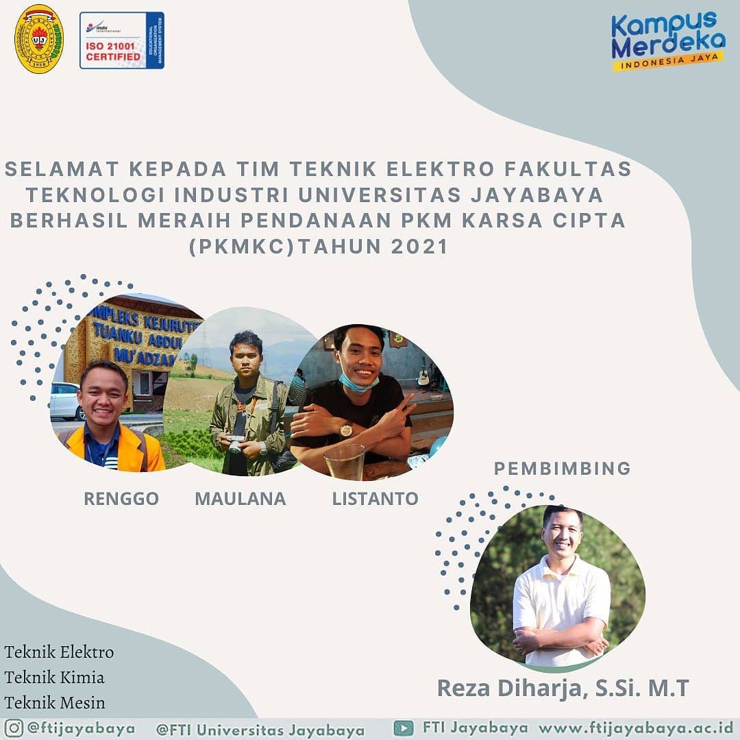 Universitas Jayabaya dengan bangga menyampaikan bahwa Tim Teknik Elektro FTI UJ berhasil meraih pendanaan Program Kreativitas Mahasiswa Karsa Cipta (PKMKC) Tahun 2021 dengan inovasi berjudul: