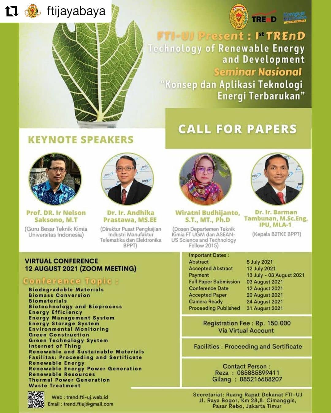 FTI Universitas Jayabaya dengan bangga mempersembahkan Call for Paper TREnD 1 (Technology of Renewable Energy and Development) dalam rangkaian Seminar Nasional bertema “Konsep dan Aplikasi Teknologi Energi Terbarukan” ♻️