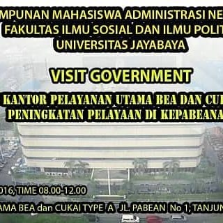 Himpunan Mahasiswa Administrasi Negara Universitas Jayabaya melaksanakan program kerja “Visit Government” dengan tujuan memperluas wawasan mahasiswa mengenai praktik pelayanan publik di instansi pemerintahan. Pada kesempatan ini, kunjungan dilakukan ke Kantor Pelayanan Utama Bea dan Cukai Tipe A Tanjung Priok, sebagai salah satu lembaga strategis yang berperan penting dalam arus keluar masuk barang di Indonesia.